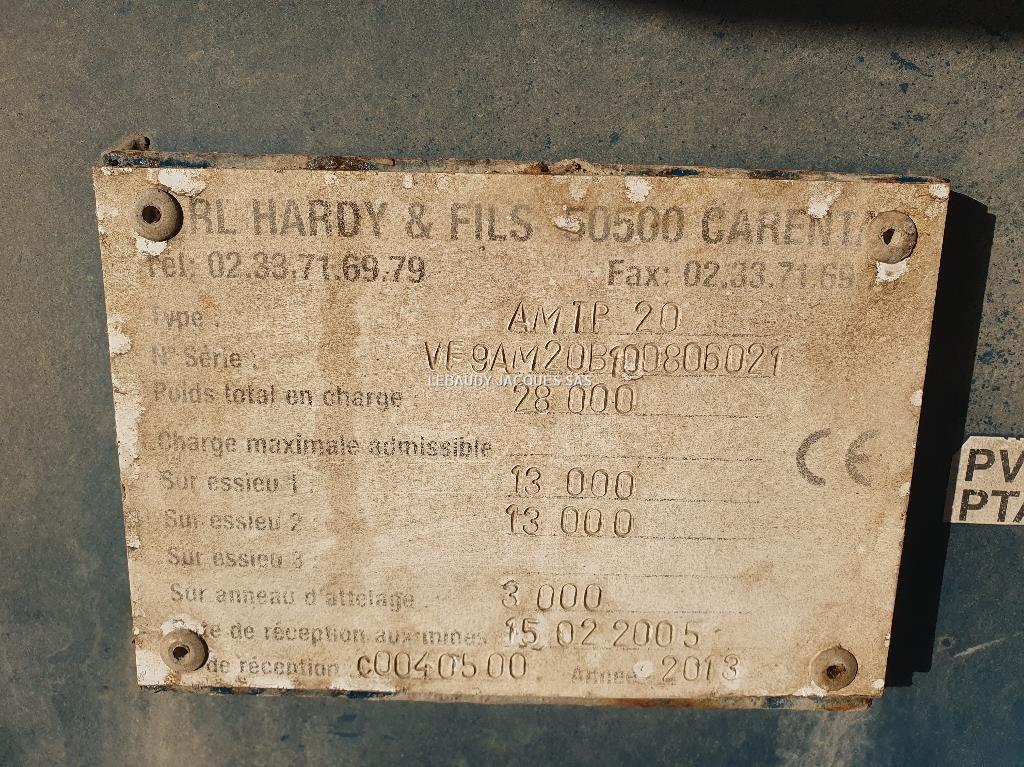 Modèle : Hardy ATP 20 Année : 2014 Charge utile (T) : 20 Attelage : CHAPE K80 Suspension flèche : MECANIQUE Type essieu(x) : BOGGIE Section essieu(x) : 150 Marque pneus : ALLIANCE Dimension pneumatiques : 24R20.5 Usure pneus : 60% Compléments : PREMIERE MAIN DEPOT-VENTE CLIENT TELEPHONER DIRECTEMENT AU 06 83 83 92 99