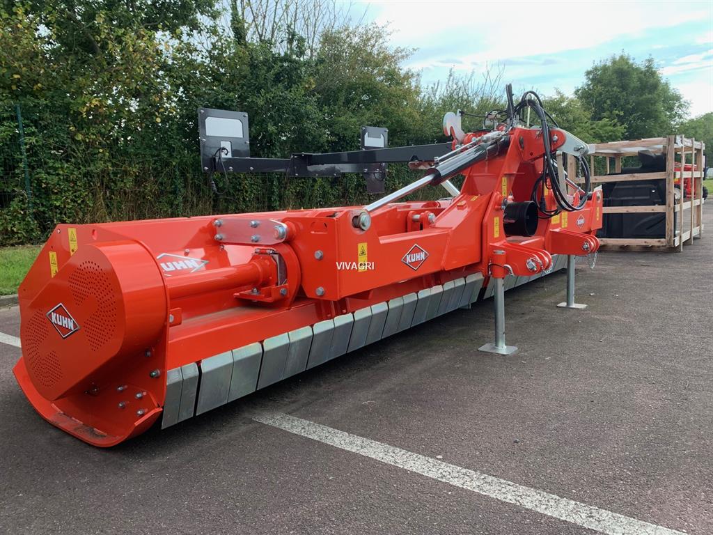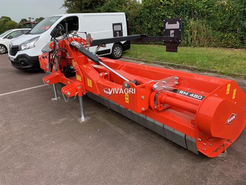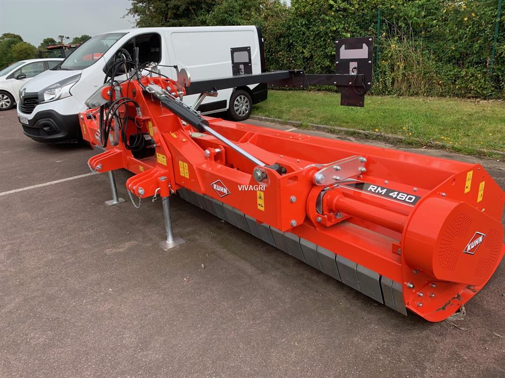 BROYEUR KUHN RM 480 R, BROYEUR KUHN PORTE REPLIABLE RM480R, LARGEUR DE TRAVAIL: 4.8M, DIAM. ROTOR: 620, EQUIPE 56 MARTEAUX CUILLERES LONGS ET ROUES SEMI-PIVOTANTES, REF:RM480RA03, OPTIONS:, ROULEAU D'APPUI A EMBOUT DEMONTABLE REF: 1556813, PANNEAUX LATERAUX DE SIGNALISATION REF: 1556907