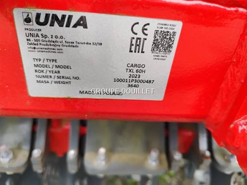 TXL 60 - DECHAUMEUR A DISQUES 2 RANGEES DE MARQUE UNIA / CARGO - CHASSIS REPLIABLE - LARGEUR 6M - ROULEAU TUBE Ø600 -SECURITE NON STOP INDEPENDANTE DES DISQUES PAR SYSTEME SILENTBLOCS - REGLAGE HYDRAULIQUE DE PROFONDEUR