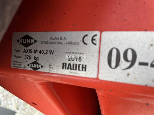 Marque : KUHN Modèle : Axis 40.2W Année : 2016 Largeur travail (m) : 36 Capacité (litres) : 4000 Entrainement : MECANIQUE Commande ouverture : ELECTRIQUE DISQUES S8 LIMITEUR BORDURE HYDRAULIQUE