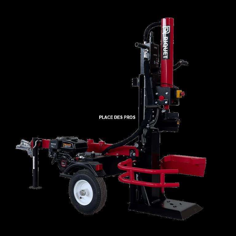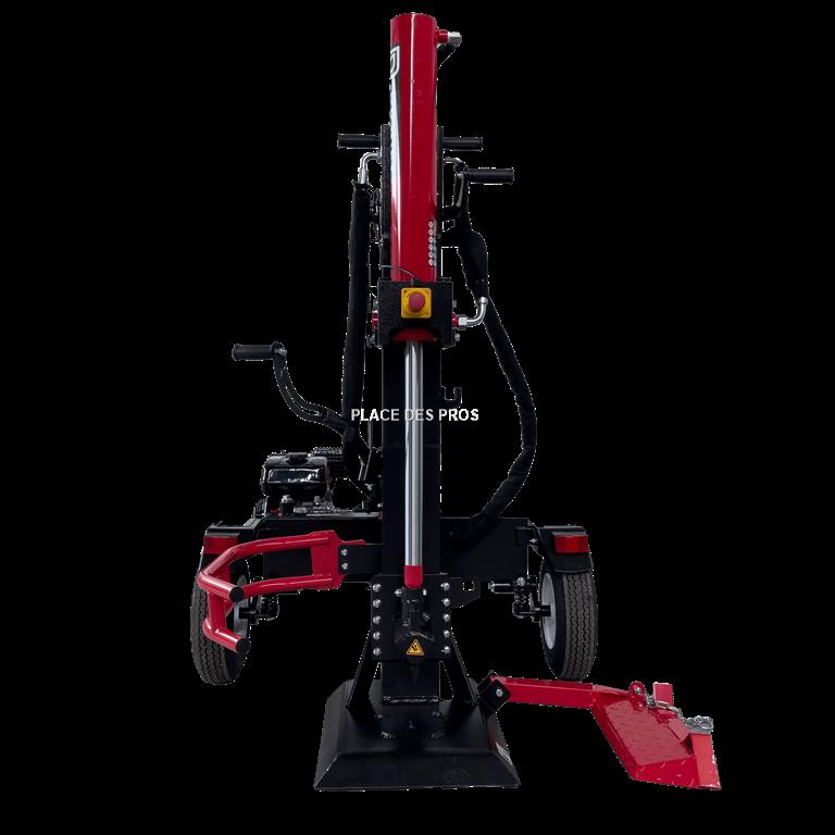 Fendeuse 22T sur Remorque avec châssis à attelage à boule Travail en position vertical Moteur Loncin 196cc, 6,5cv à démarrage manuel Dégagement sous outil de coupe 610mm Centrale hydraulique indépendante avec réservoir 14,5L Arrêt d'urgence Retour automatique de l'outil de coupe Poids de la machine 251kg Dimension du colisage 203cmx58cmx74cm