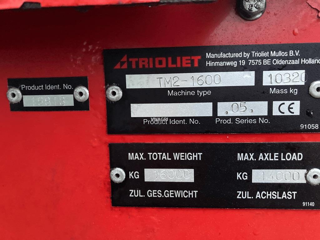 MELANGEUSE TRIOLIET TRIOMIX 2, MELANGEUSE TRIOLIET TRIOMIX 2 1600 DOUBLE VIS 16m3 TRITRONIC PESEE EL, ECTRONIQUE 2400 V SYSTEME DE COUPE HYDRAULIQUE 1CONTRE COUTEAU - BORD, D USURE CARDAN GRAND ANGLE - ESSIEU TANDEM PENDULAURE PNEUS : 435/50/, 19.5 TAPIS AVANT LATERAL - CDE ELECTRIQUE KIT BETTERAVE BOITIER PLANET, AIRE COUTEAUX LON AU LIEU DE STANDARD COUTEAUX COURT TRIOFORM BEQUILLE, HYDRAULIQUE-BRANCHEMENT DIRECT