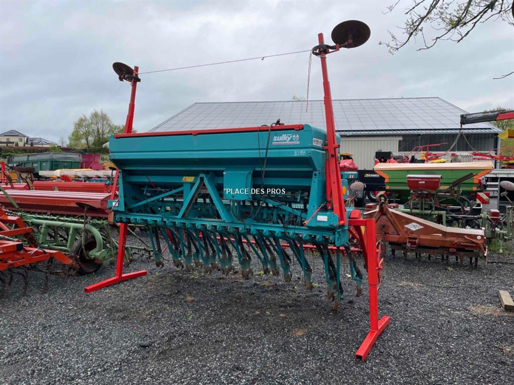Semoir Sulky Trameline Comptact, 21 rangs, traceur hydraulique, attelage embarque triangle, passerelle de chargement arrière, herse arrière