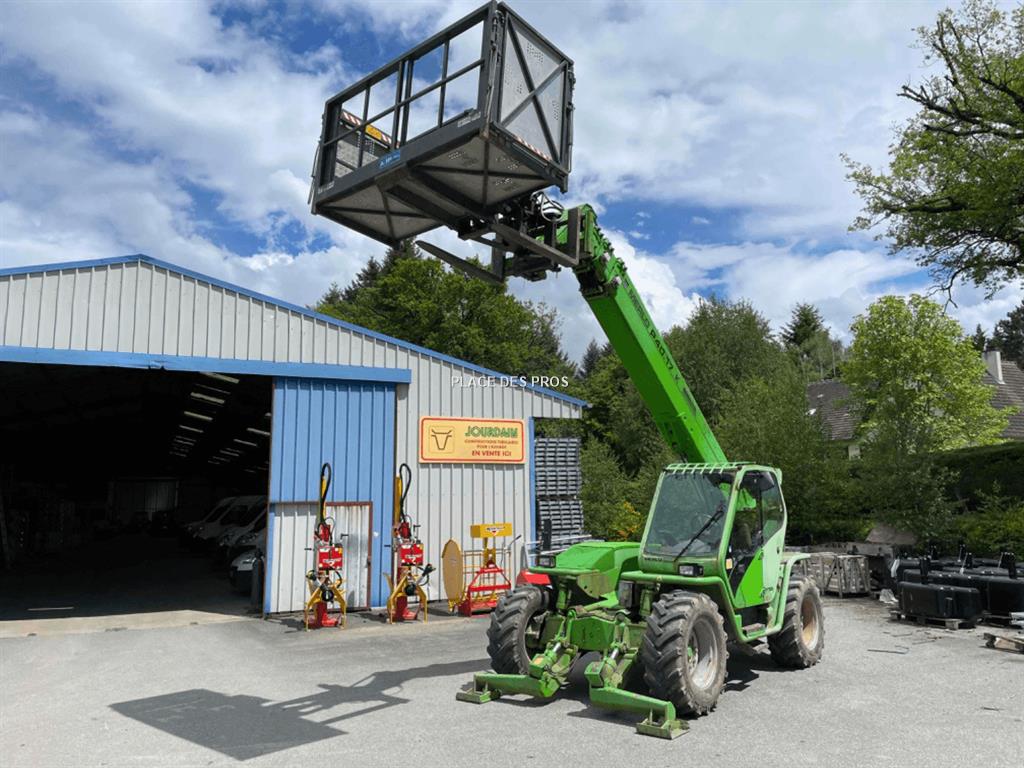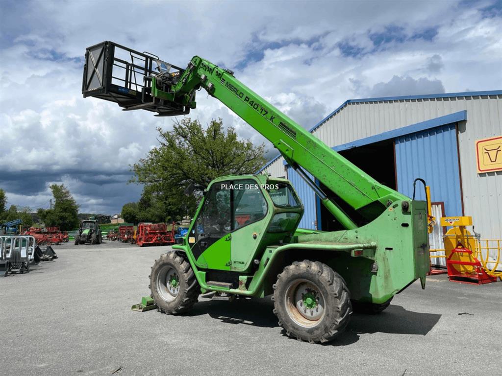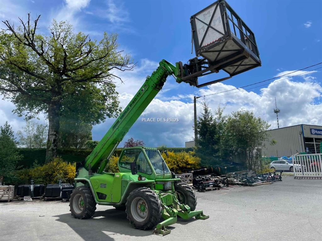 Télescopique Merlo P40.17, moteur Deutz, boite de vitesse hydrostatique, capacité de charge 4T00, portée 17M00, radiocommande, nacelle, stabilisateur avant.