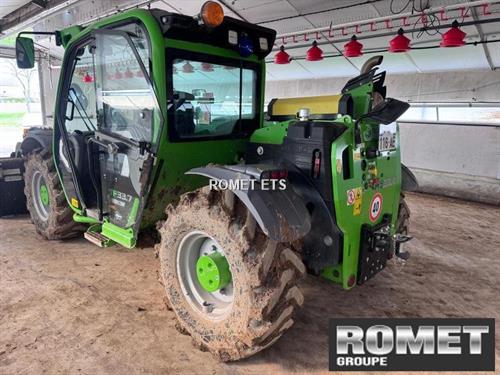 Moteur Deutz 3,6L 115 cv Stage 5 Ventilateur réversible "Fan Drive" Transmission hydrostatique MERLO Boite 2 rapports - 40 Km/h Load sensing 125 L/mn à 210 Bars Distributeur Flow Sharing 4 roues directrices -3 modes de braquage 2 fourches flottantes+dosseret de charge Siège pneumatique Garde-boue Verrouillage godet hydraulique Chappe AR Prise élec en bout de flèche