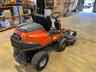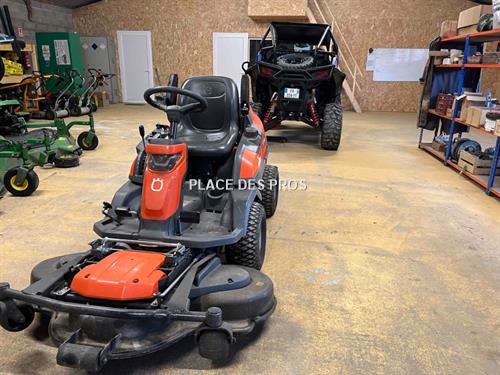 Tondeuse Husqvarna Rider 420TS AWD, largeur de coupe 122cm, moteur Kawasaki bicylindre, boite de vitesse hydrostatique, 4 roues motrices, relevage hydraulique du carte, coupe frontale, direction assistée.