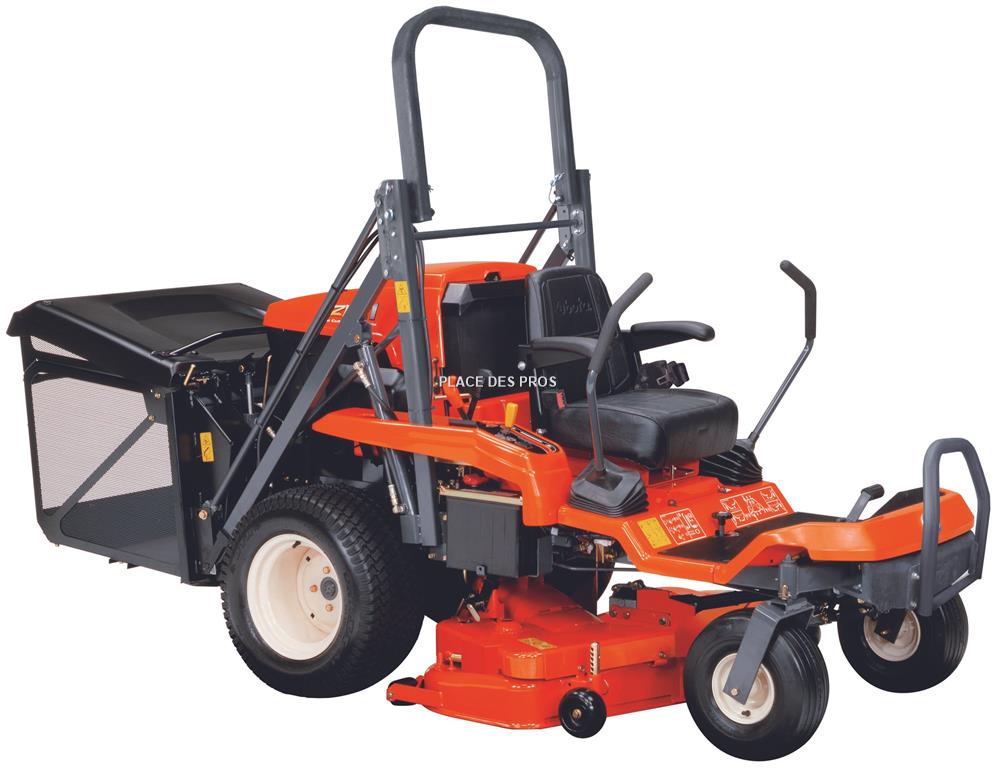 Tondeuse Professionnel Kubota GZD21 HD Moteur diesel Kubota 21ch 3 cylindres Transmission hydrostatique par 2 leviers Coupe 1m22, transmission par cardan Kit lame pro Bac 500L Siège réglable Bennage en hauteur de 0.90 à 1.80m Contrepoids additionnel