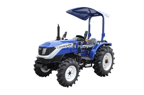 Tracteur Lovol M404 Version arceau Moteur Doosan 1800cm3 3 cylindres Puissance 40ch 4 roues motrices Transmission mécanique 8 vitesses avant, 8 vitesses arrière Inverseur mécanique synchronisé Blocage de différentiel 2 distributeurs double effet Prise de force indépendante 540 et 1000tr Masses avant Pneus radial 260/70R16 320/85R24 profil agraire Homologation route